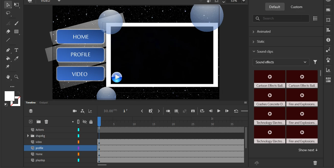 help me make that play button funtioning on the imported video pls! i need it able to play and pause the video. btw, i'm using adobe animate 2023