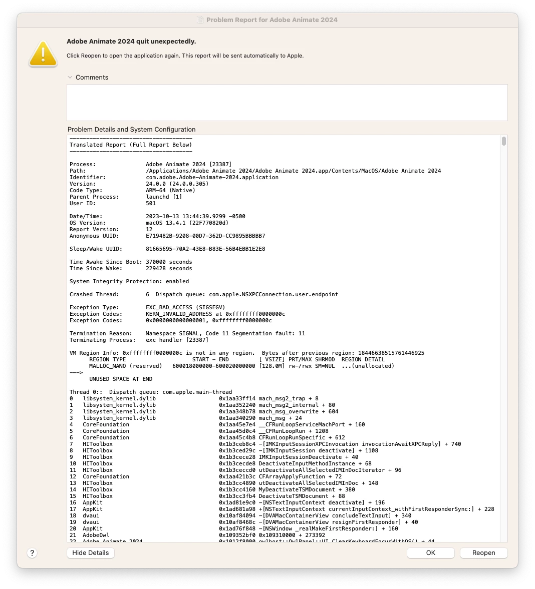 Hi, I've been having an issue with the latest version of Animate. Whenever I try change the different styles of line width the software will crash. Here's a photo of the error I get