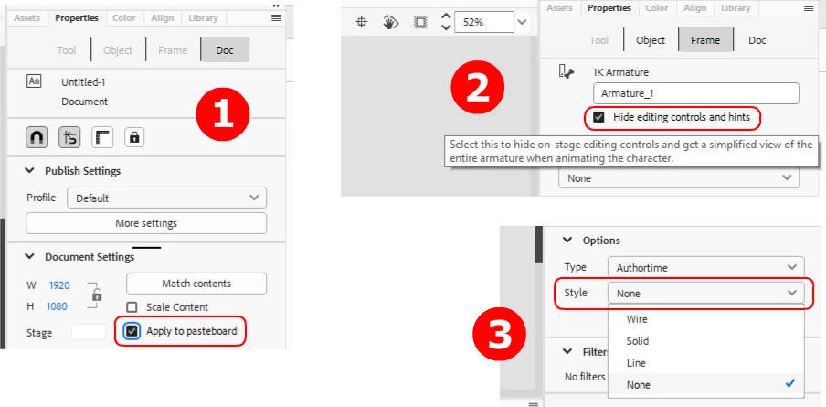 Can't find it in the JSFL: Apply to pasteboard, Hide editing controls, Bone style