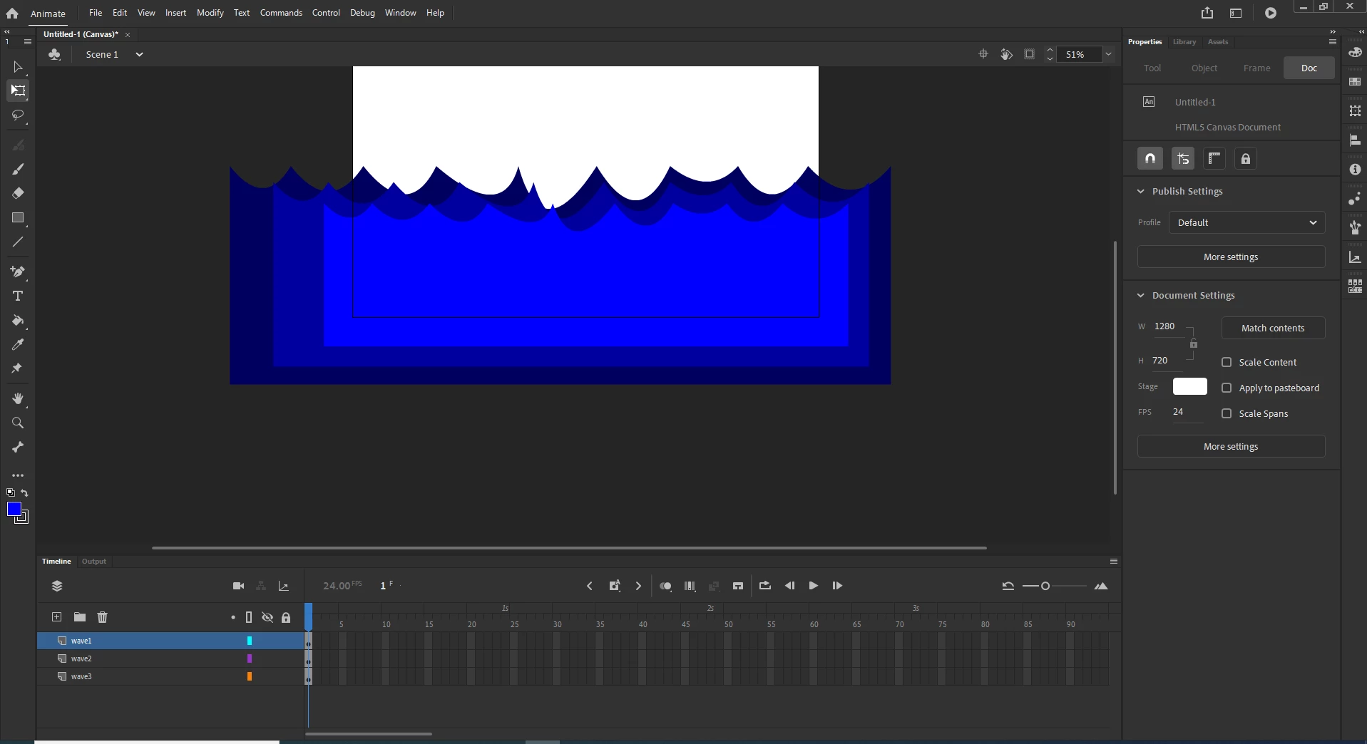 To add to the wave effect I have reused the wave movie clip, added these to extra layers wave1, wave2, wave3.