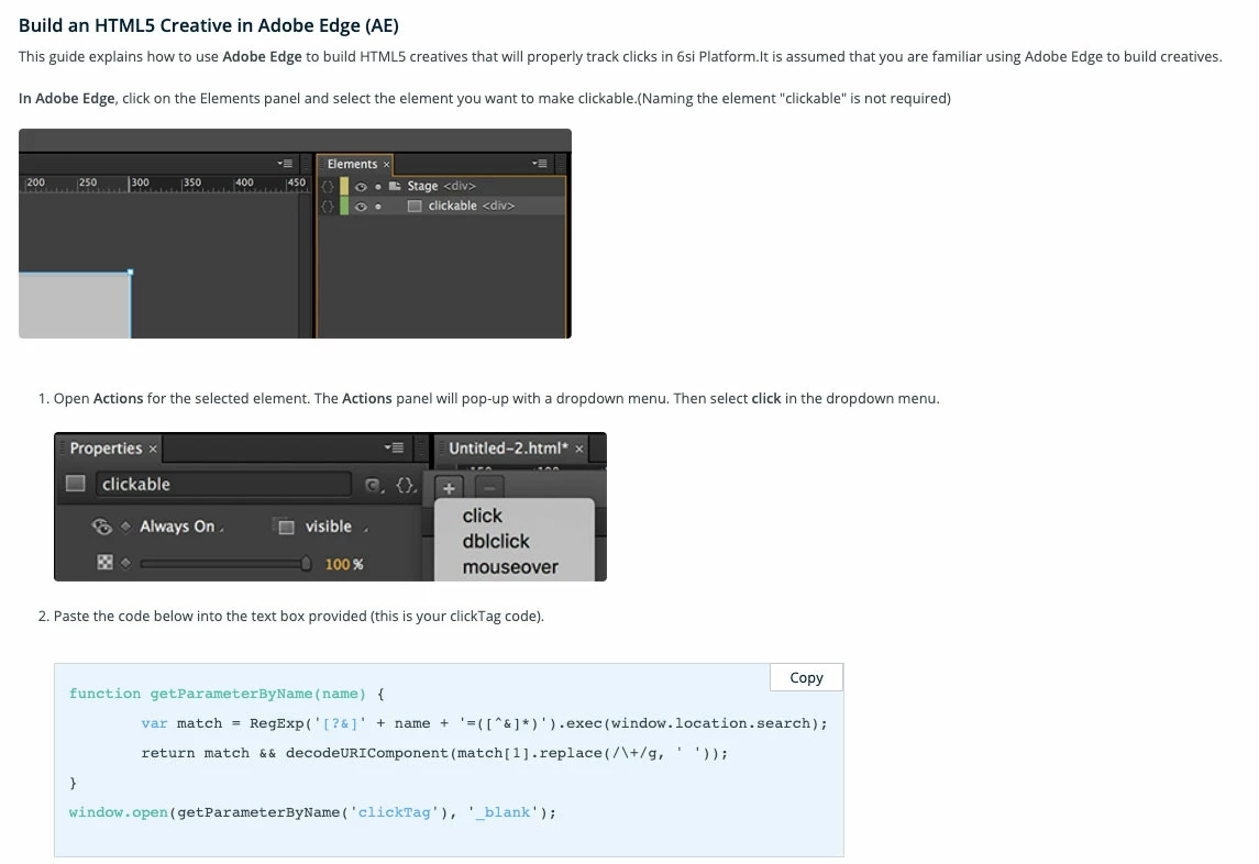 Anyone have tips on how to get clicktags to work with 6sense banners built in Adobe Animate? The had a reference doc on 6sense (attached below) but the code was written for Adobe Edge so didn't end up working when I plugged it into Animate. Maybe someone knows how an updated version of this code might look going from Edge to Animate? Thanks in advance.