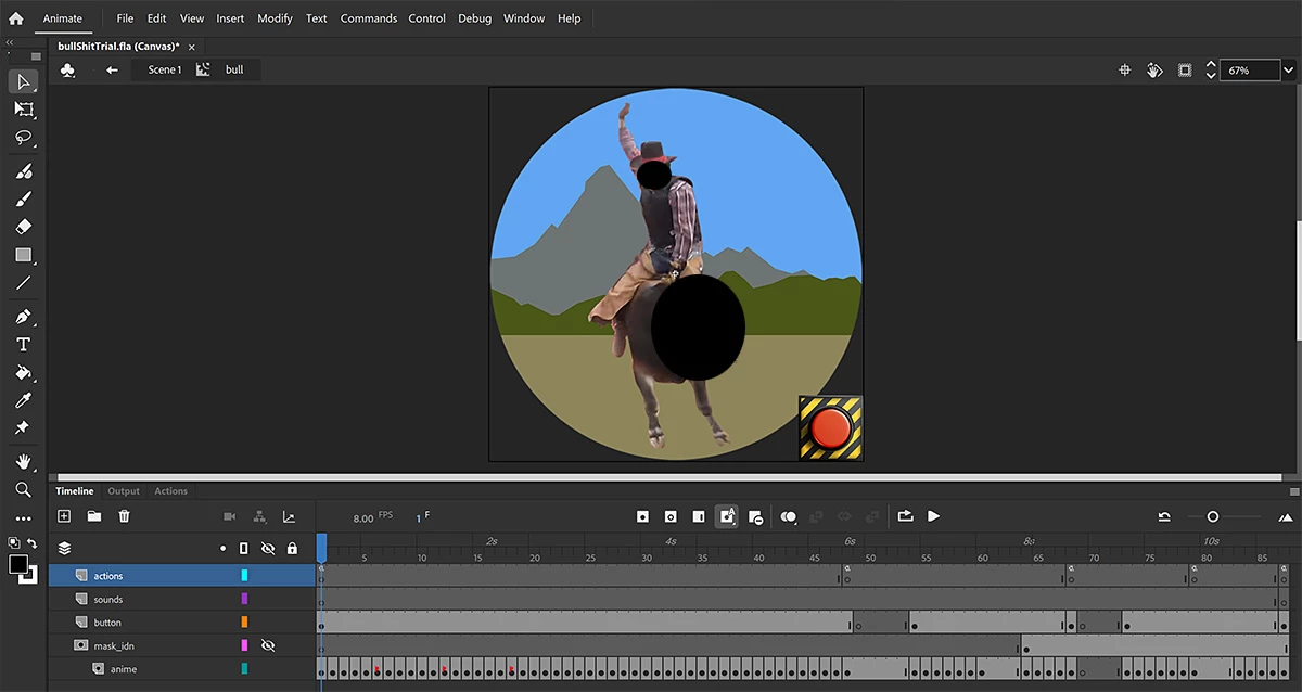 Now inside the movie clip, Click the new button to jump off the bull and depending on the current frame number, you either land on your feet or land on your side. (the key is to click the moment the bull's Butt or Right Side is exposed)