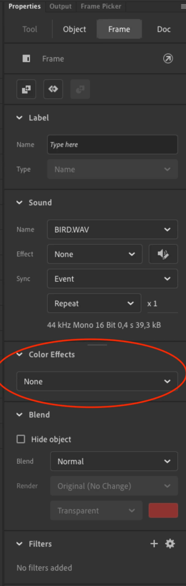 Since version 2019, Animate allows you to apply blending modes to graphic symbols in the selected frame. I want to apply to a graphic symbol a blend mode by command, but it applies it in object mode and my desire is to apply it in the frame. Copying what it does in the labels I create this: