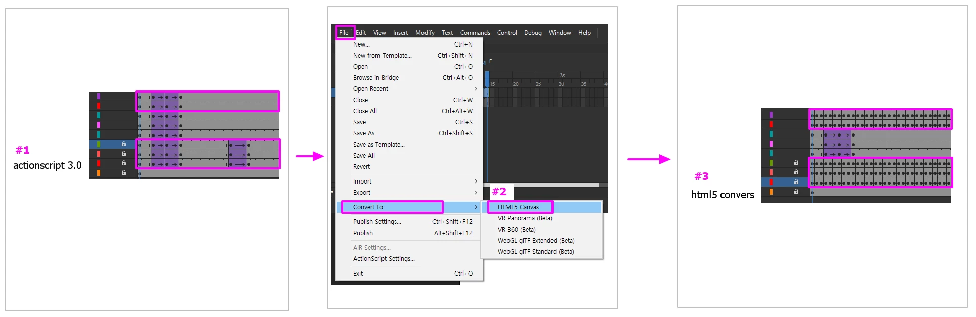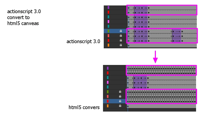 #1) Look at the pink boxed layer frame. #2) Select Menu → Convert to HTML5 Canvas #3) Look at the pink box in #1. All frames are taken. - Modification after conversion to HTML5 is difficult. - Error with unknown cause. - I have a very hard time. help.
