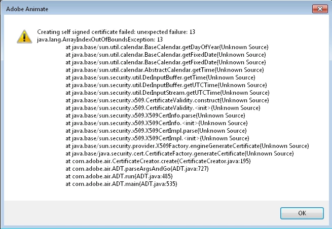 I am trying to create a new certificate in Adobe Animate CC 2019 but I get the following error "Creating self signed certificate failed"