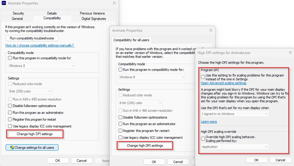 I have a problem with adobe animate, so when I try to transfer the program window to my screen graphic tablet, the program starts to display pixelated as you can see in the first photo, it displays normally on my main moinitor, I will add that I had no such problem with adobe photoshop. Can it be fixed somehow?