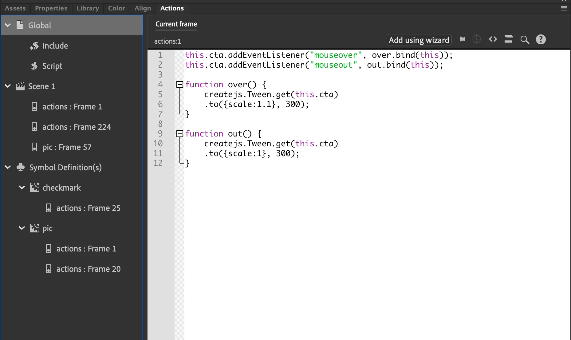 and when I view the Actions window I am able to see functions written to parts of the file like scenes and symbols that have hover-over interactions, but none that look like the hyperlink.