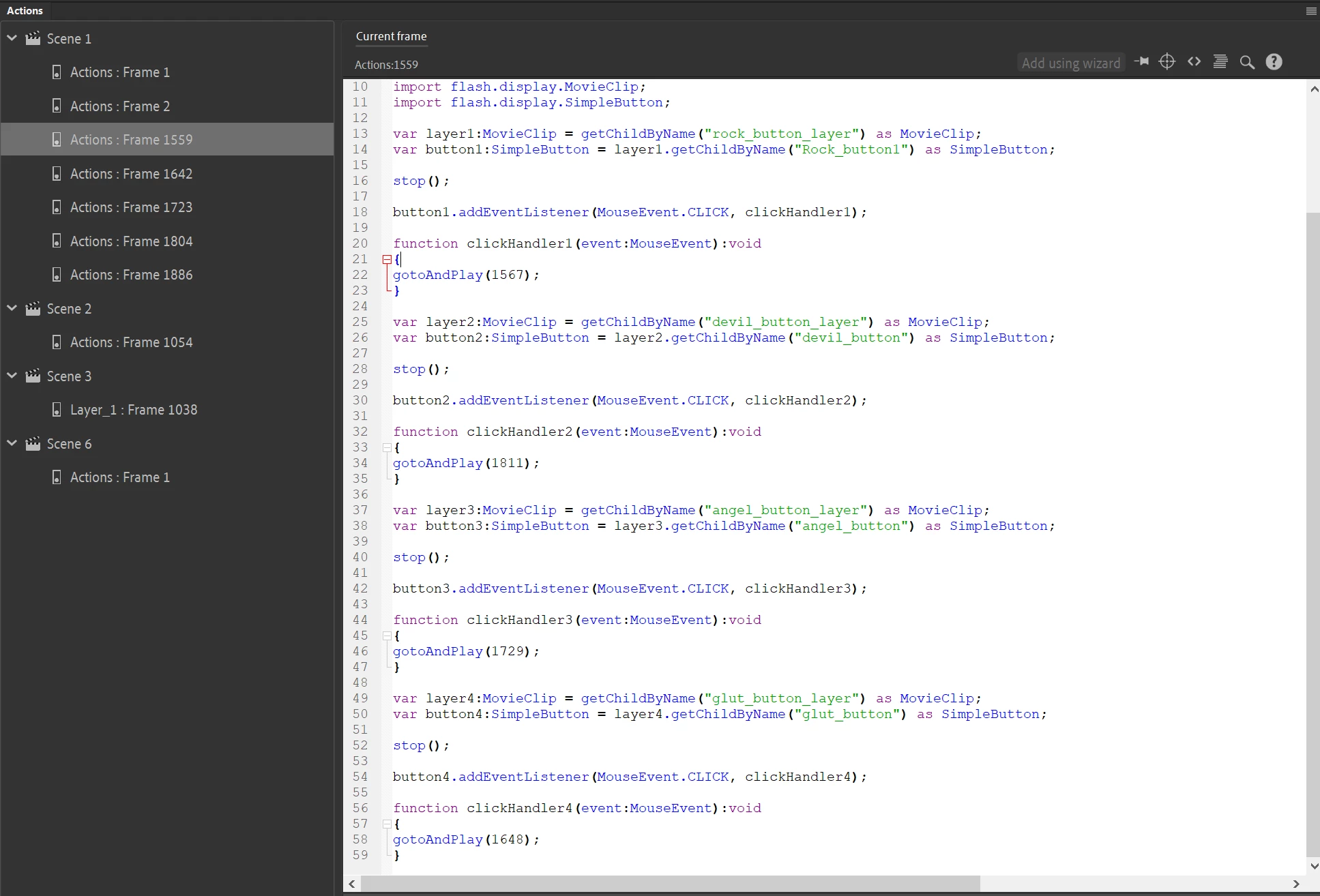 frame1559:18 is button1.addEventListener(MouseEvent.CLICK, clickHandler1);