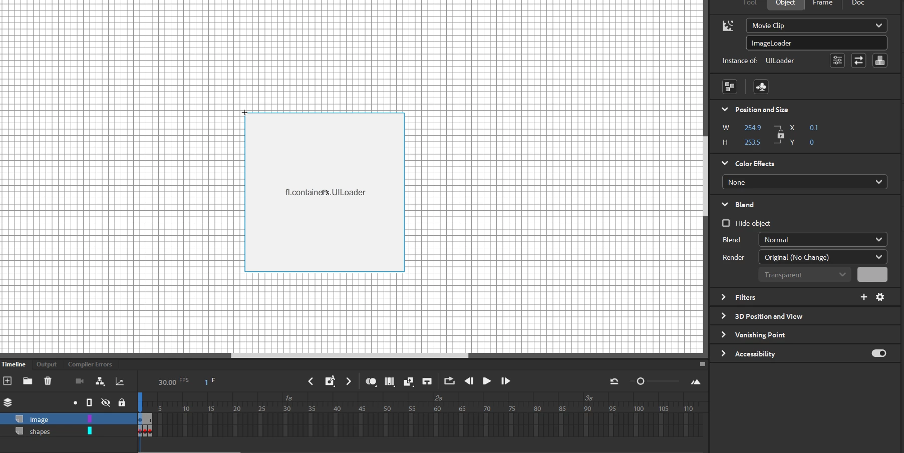 }ImageLoader is a UI component, as you can see I have the loader in 3 the Image Layer and it span over 3 frames. adobe animate doesn't complain, it compiles and works, so why the gfx fails