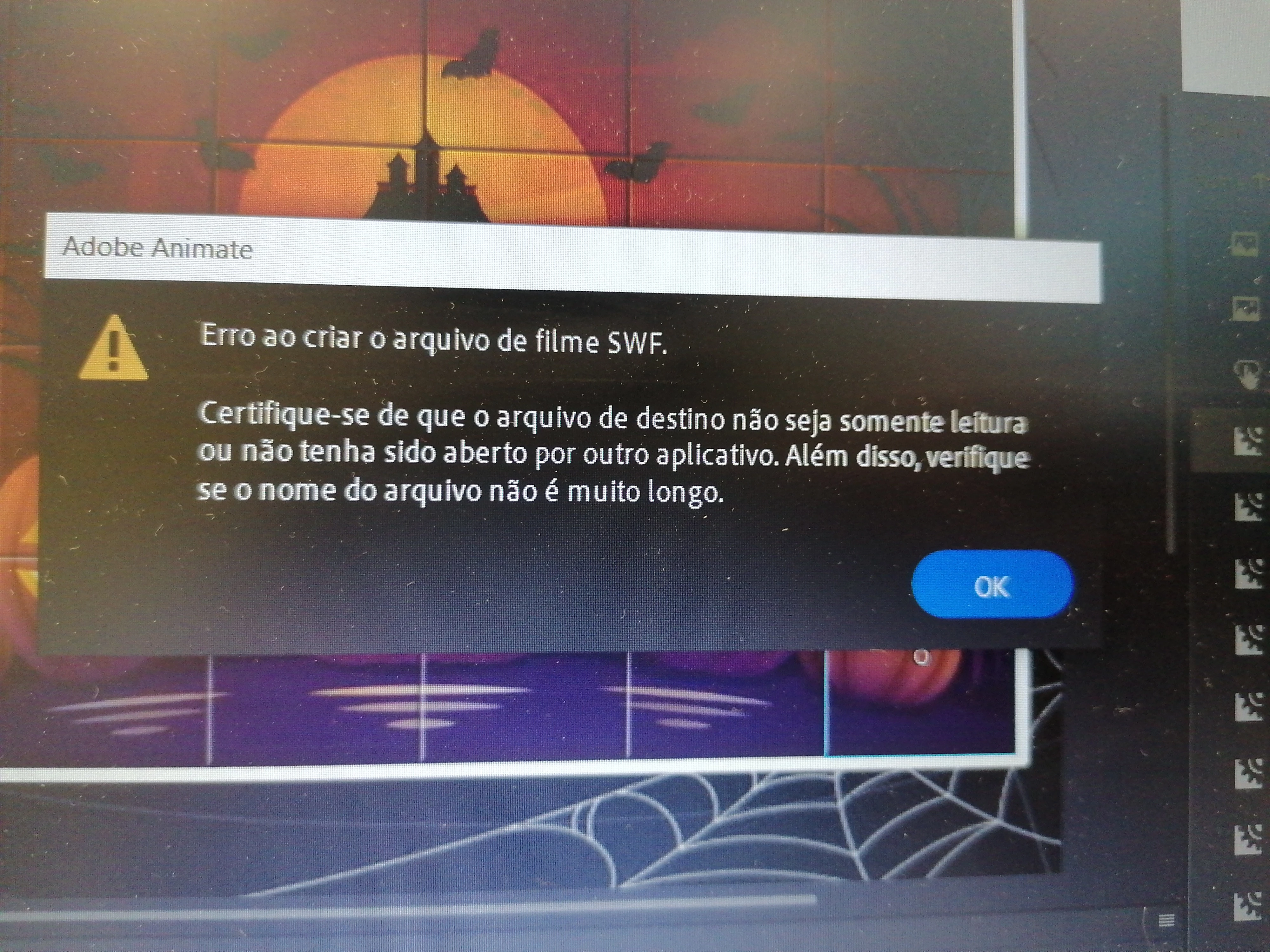 Sempre que tento testar a minha animação aparece esta mensagem : "error when creating swf movie file. Make sure that the target file is not read-only or has not been opened by another application. also make sure the file name is not too long".