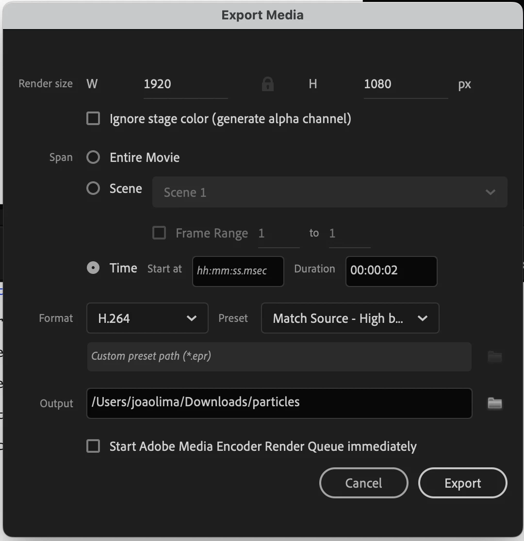 Now I export via Video/Media choosing 'Time', which worked with Flash and AS3 before.