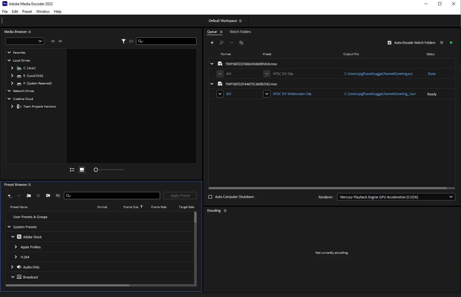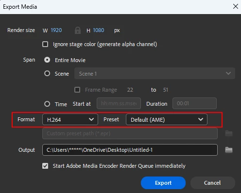 Try using Format: H.264 / Preset: Default (AME) instead, this will give you a standard MP4 video that matches your document settings.