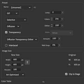 I'm trying to export a gif in Animate CC. GIF only has one color in it and that is black. I still get white lines around the gif when I export it because it has a transparent background. Matte option is grayed out and can't be changed.