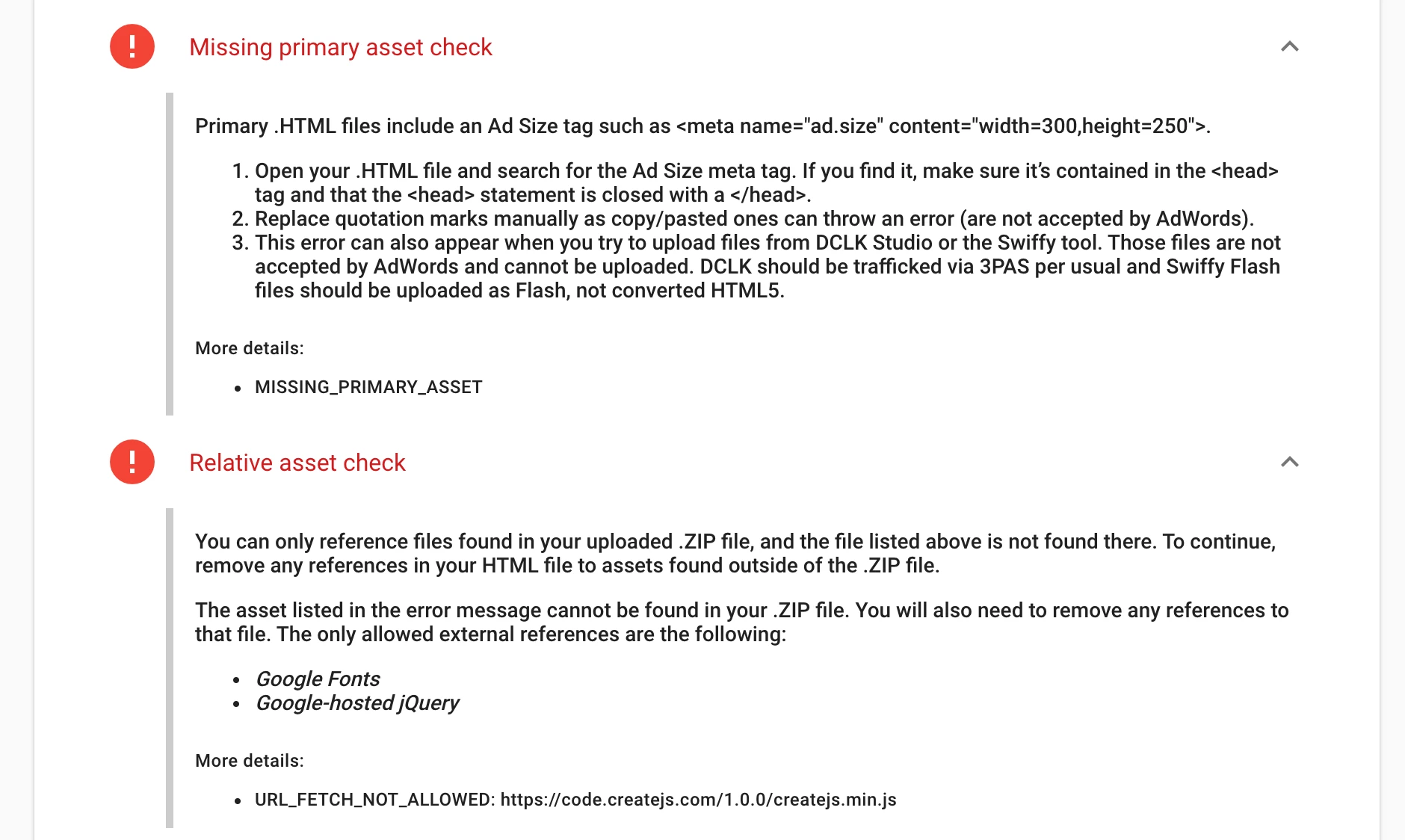 Hello! I am publishing html5 banner using adobe animate and when I upload it to 'ads validator', it give errors(as shown in the screenshort attached) and when I remove the errors(adding the size, the first error and deleting the script, the second error), the html file don't have anything except the canvas in it.