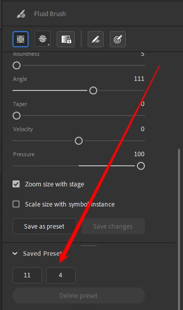In the Fluid brush properties panel it gives the option to save settings as presets but gives no option to select the one I saved earlier.