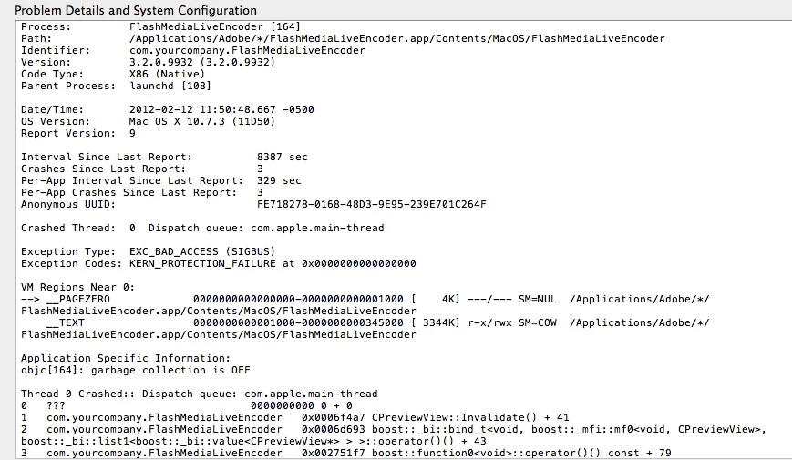 Update from xcalybur75. I couldn't wait for Adobe to fix this so I had to buy an external HD, backup via time machine, format my hard drive and reinstall Lion up to 10.7.2 then restore from my time machine backup and it worked fine. I still have the crash problems with FMLE 3.2 and 3.1 where it crashes anywhere between 1-5 times at launch until finally it works. Once it works, I've never had it crash during streaming. I have had it crash at quit once.