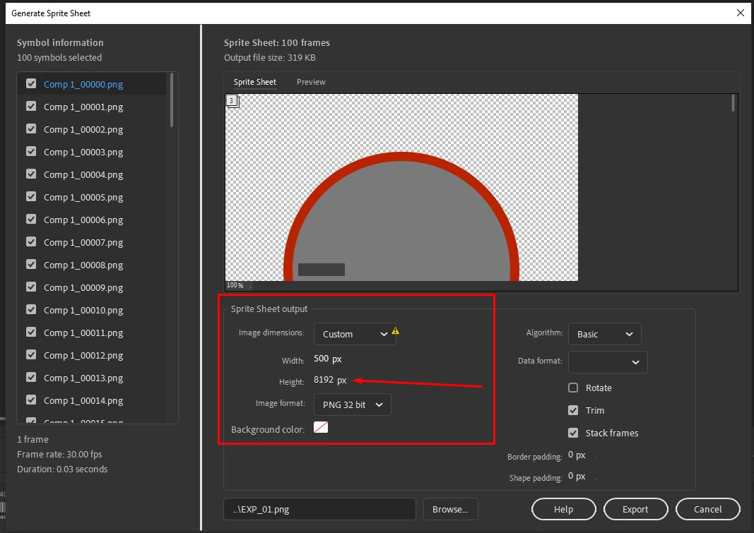 I have a sequence of 100 frames of an animation. Each frame is 500 x 500 pixels. I import my PNG sequence on the timeline and then Select all frames, and generate sprite sheet. in order to get a vertical sprite sheet generated I do the math: 100 x 500: 50000px Height, 500 width, but the limit is 8192, from what animate is allowing to be. Is there a work around this?