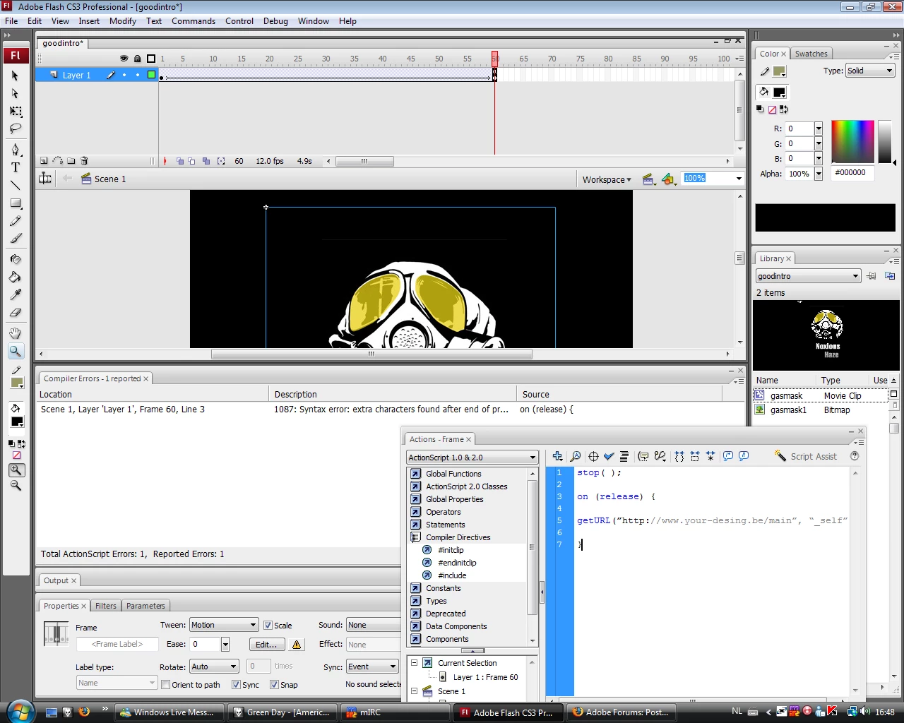 I have a problem. Im very new with Adobe Flash CS3, i just started. Now i have a flash-movie with 60 frames. It goes from very blurry to normal, thats all fine. Now i have stop( ); on the last frame (to stop the animation, i dont want it to repeat again) . Now i want that you can click the animation so you will be forwarded to a following page. So after some google'ing, i found this: