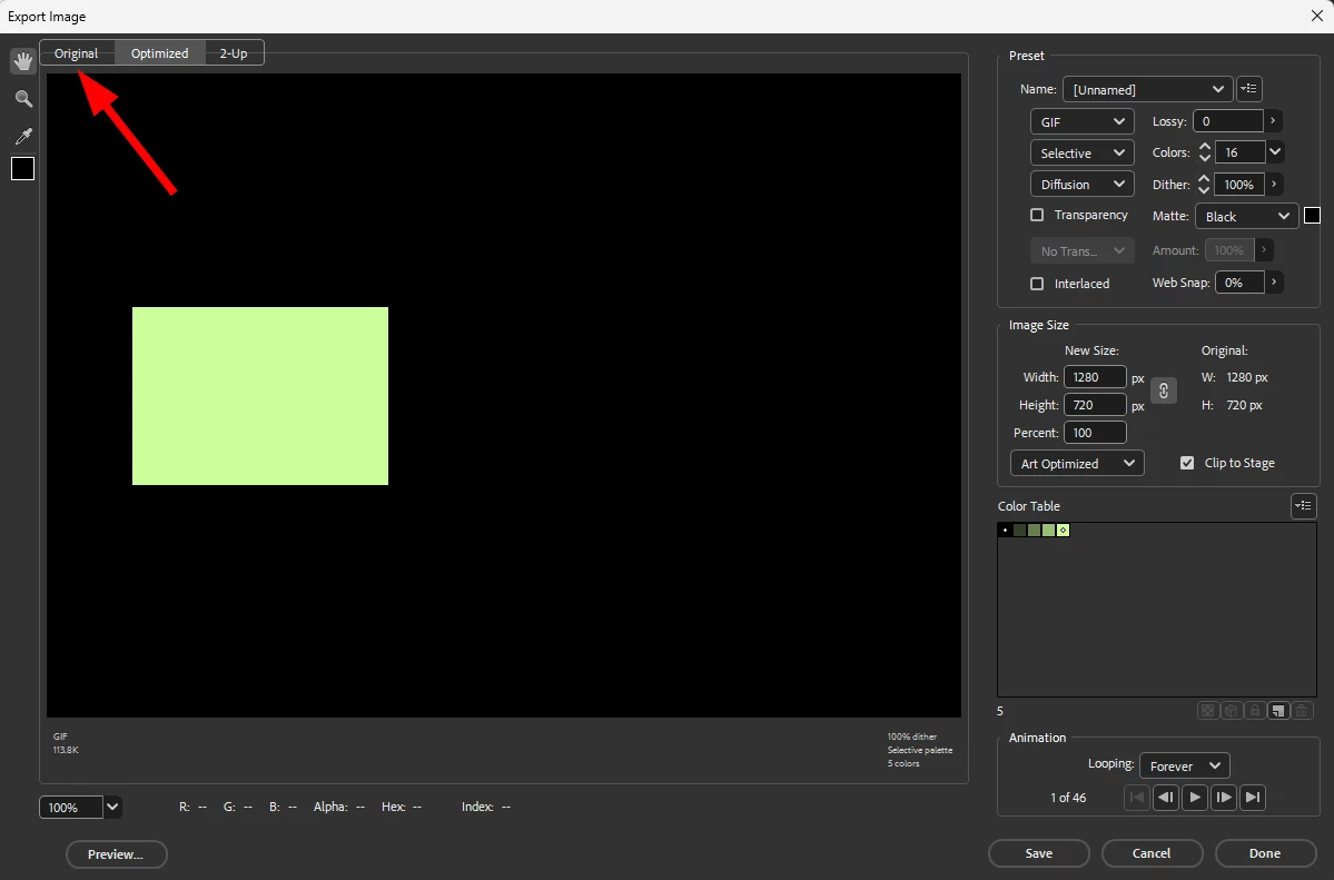 I am trying to export animations as gifs. I have these sat up for videos for other uses, so I would like to export them at 50% as gifs. However I've been running into this issue where I set the percent and export it, half the time they remain the full size. What I have noticed is this happens when the preview does not update after I change the image size. What I do is go to "Export Animated Gif..." then the export window pops up with an additional pop up titled "Processing..." with a progress bar. Then when that's done, I change the percent to 50 and click out of the text box. Which then it should automatically run the "Processing..." pop-up again and update the preview, then when I export the gif is correct. However half the time after I change the size, that pop-up will not appear again, the preview will not update, and the exported gif will be exported in the original size.