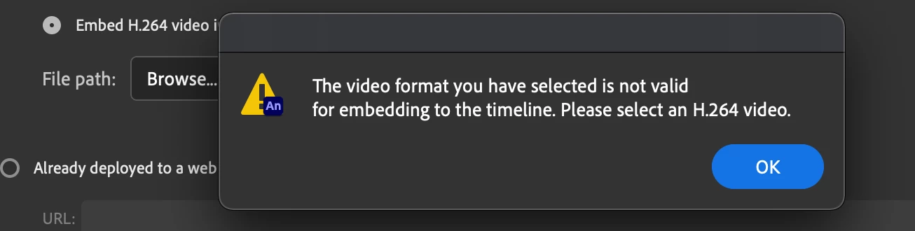 I've exported straight from after effects, converted to every type of h.264 type i could see in media encoder, EVEN used the option in Animate where it 'converts' the file to a usable type when importing, and it STILL just keeps telling me it doesnt work and to give it a bloody H.264 format!