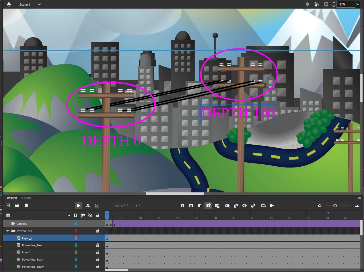 I would like to know if there is a way to attach the 2 end points of 1 line stroke to 2 seperate layer depths. So, when the camera pans, the lines adjust accordingly making it appear as if the powerlines are connected to the support beams.