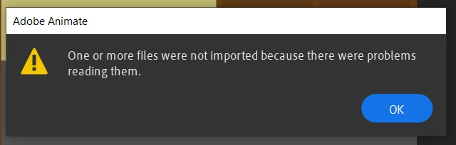 I am getting this error when I try to import things into Adobe Animate like wav's and png's. I am using the newest version. Though when I go into Google images and copy a photo I can still paste it into Animate, I just can't import files from my computer.