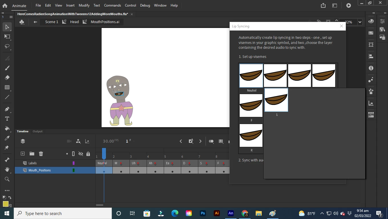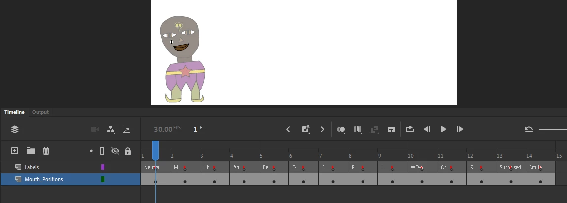Hi, I made all the different mouth shapes for lip syncing as graphic symbols but the visemes won't show up in the lip syncing area. The only one that is showing up is the 1st one. I was following the steps for Adobe Animate Classroom in a book 2021. Initially, I had 1 mouth shape, then, I swapped it, and deleted the old symbol in the library panel. Afterwards, I added all the other mouth shapes, for the mouth area. I don't know if that's why its not working. When I move the character from one area to another, the mouth stays with it, so it might be fine. Anyway, I added a layer with labels to the top of the mouth positions like the book said.