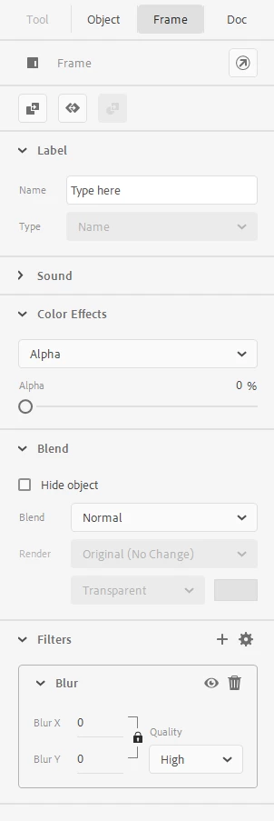 There was also an update that allowed these types of actions to be applied at the frame level instead of the object level, creating a white dot on the frame. I experimented with this, but initially encountered the same messy blend issue. Then, I found that applying a filter (like Blur) to the symbol at the frame level would resolve the blending issue. It’s strange, but it worked. Of course, I didn't actually want a blur, so I had to set the blur to 0% to keep everything sharp while fading out.