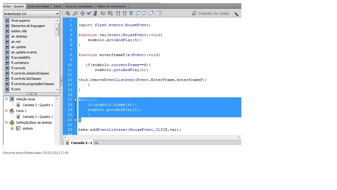 Hello! I am with a doubt, I tenjo one movie clip and inside of it I have a animation! when clicar in a button in palco, the action of the button goes to make there with that the line of the time inside of the animation of movieclip if moves for frame 5, until all good. now when it arrives in frame 6, when to arrive in frame 10 of the animation inside of movie clip has one stop (); but I want that the animation is with a Loop, of the one message of error in the window of exit of the Flash saying that frame is not a function, for the connective if I place one gotoAndPlay (); to say the connective if where the needle of the line of the time has that to be to execute the block if? it sees the code: