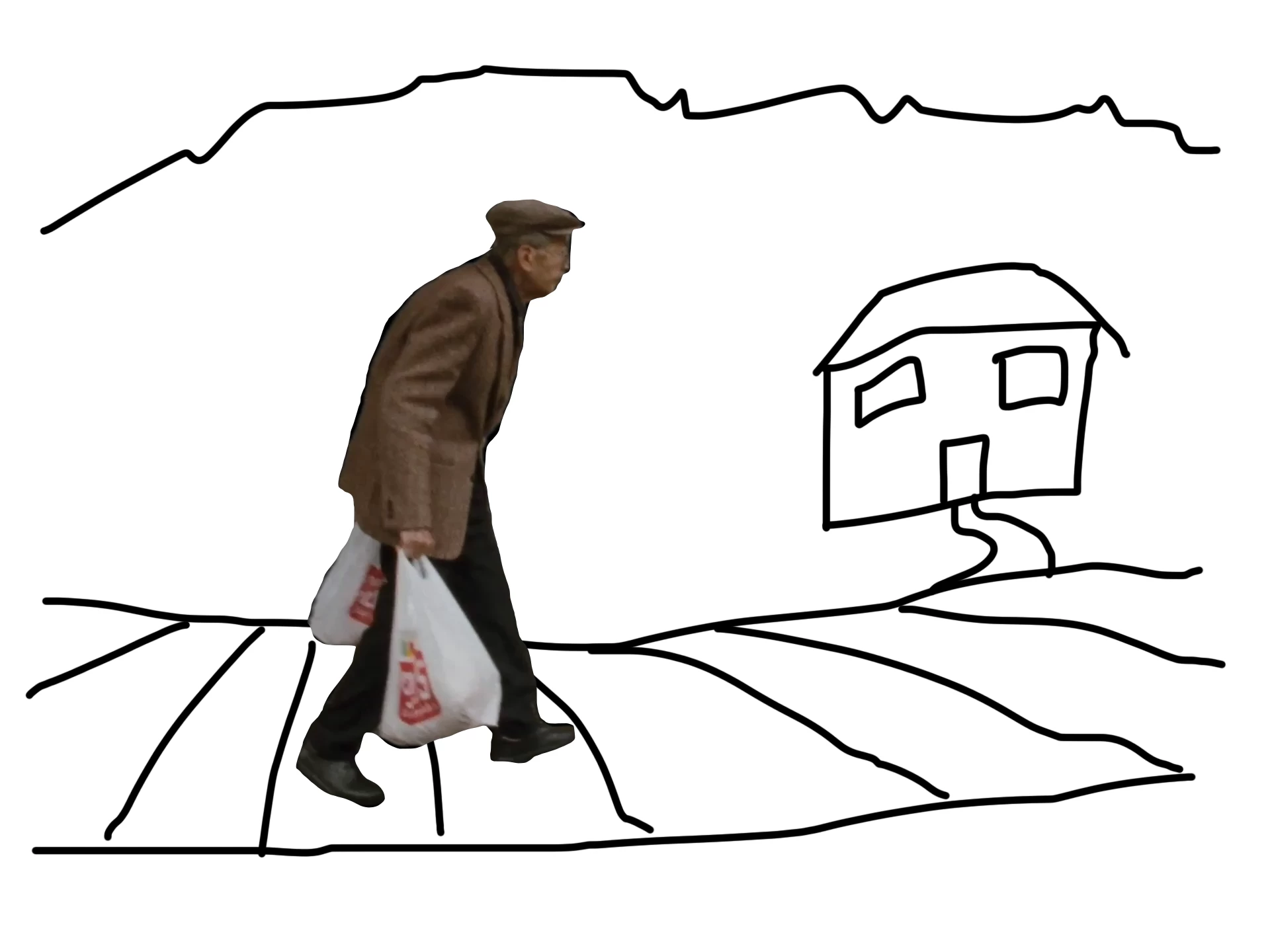 Now I want to bring this rotobrushed walking man into Animate as a series of still frames (I'm aiming to work at 12fps in Animate) and then draw some scenery behind him, frame by frame (in black, with a plain white background). See attached for a rough sample frame.