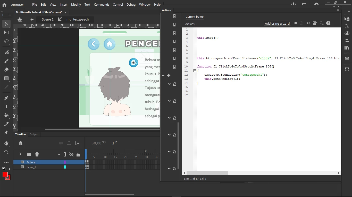 I'm using a movieclip with 2 button, here code when clicking and play the text speech