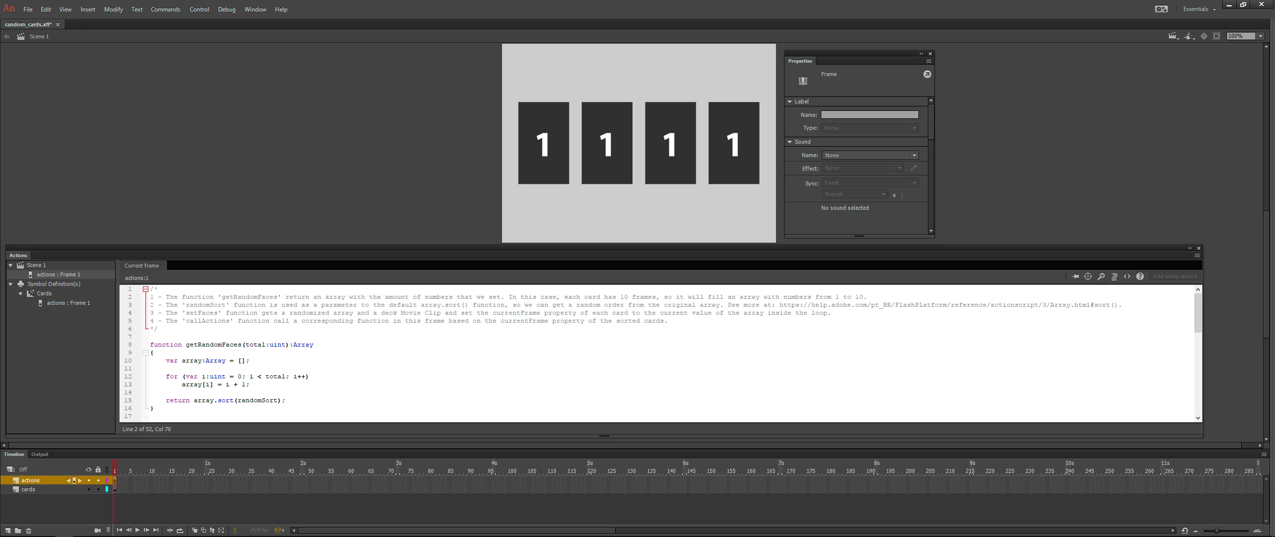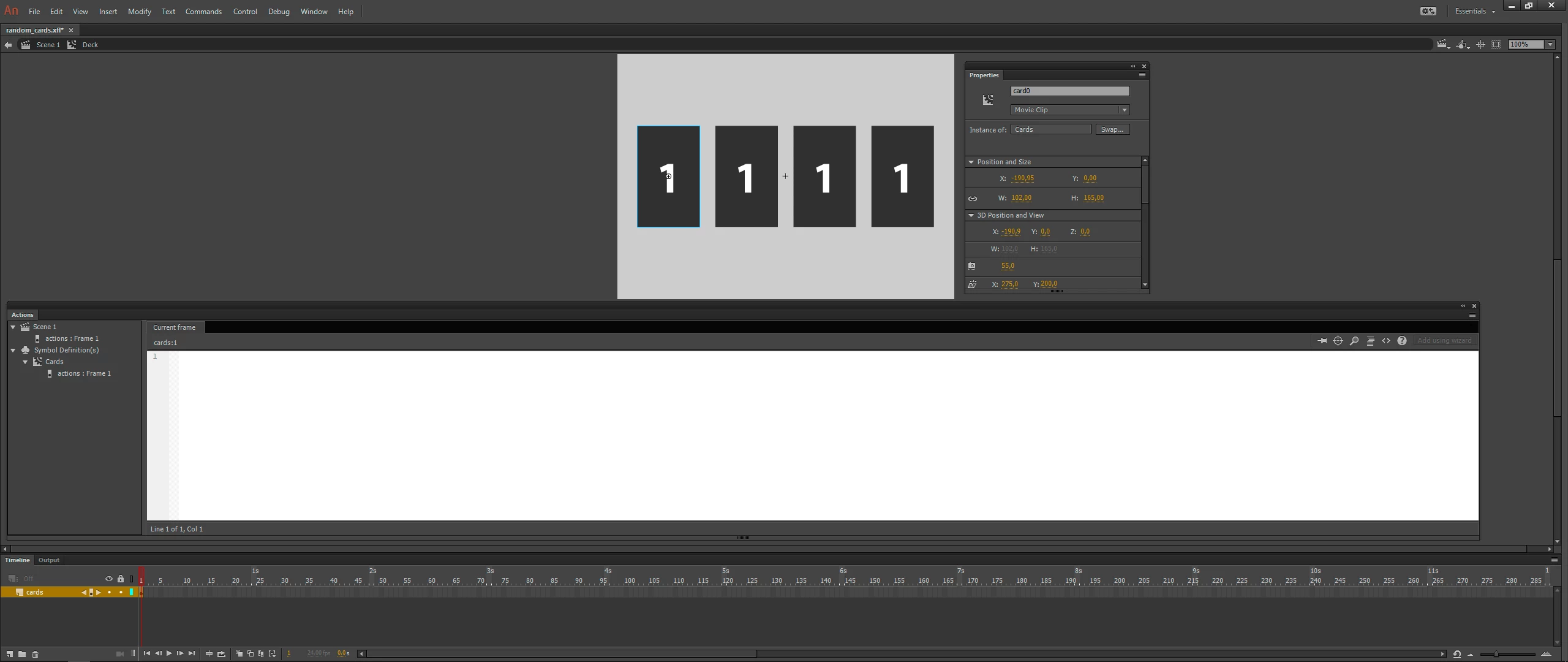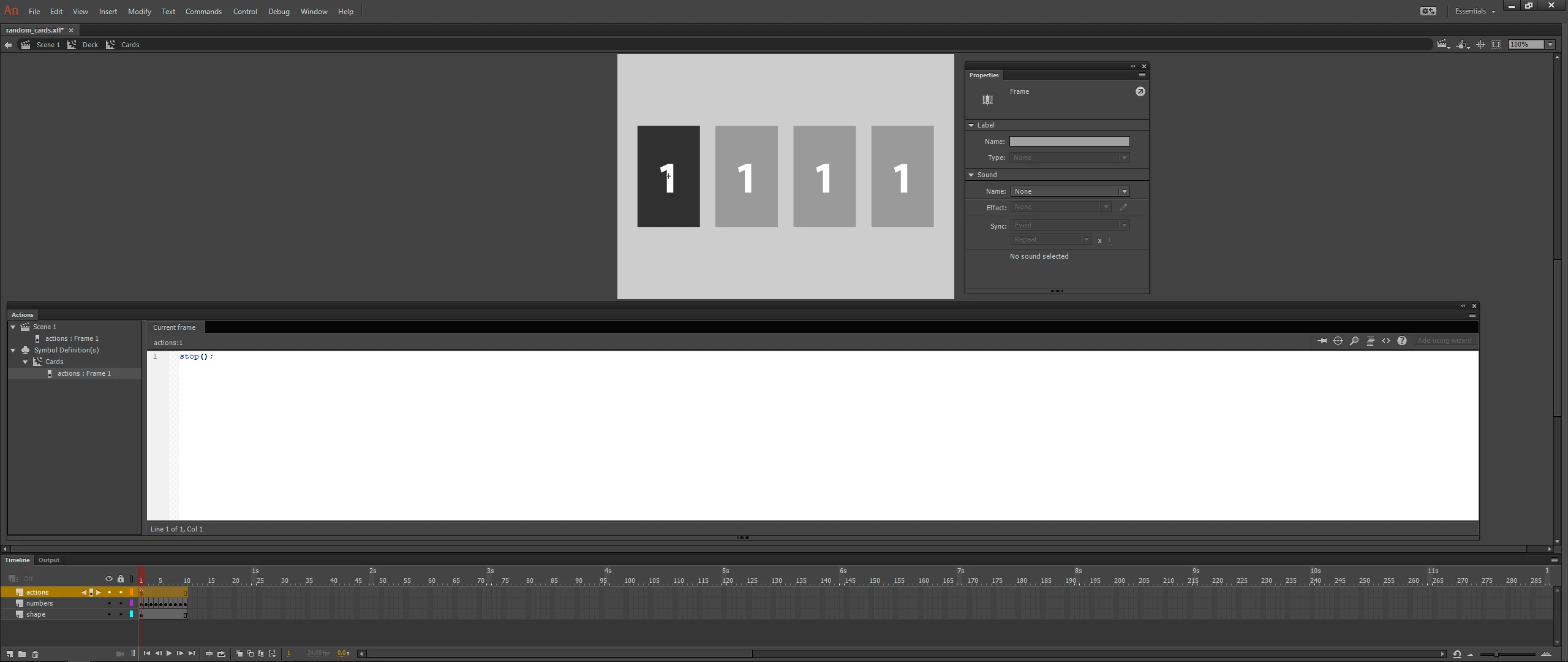 We suppose we have four places, and these places will be filled with the four random cards. And I don't know if the cards should be in a movieclip but in differents frames or in differents movieclips.