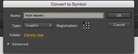There are other ways to animate as well in Animate and if you click drag across all the frames and right click to select them, then copying them all en masse you can now place them in a symbol by hitting F8 and naming your symbol man waves (change the Type to Graphic).