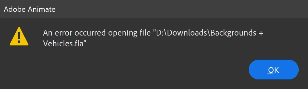 A buddy of mine got me into the madness combat series a while back, and i originally started work on one of my own animations, but i ended up stopped due to not having enough free time. now its been a while, and i have a newer version of adobe animate but when i try to open the files it tells me that there was an error when opening the file, the files are very old like 2011 old but they worked fine a while ago, any help would be much appreciated.