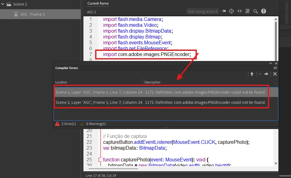 I'm having a problem with my Action, when I try to import (import com.adobe.images.PNGEncoder) nothing appears in the menu, it's empty and then the error appears as shown in the attached image, can someone please help me, what could be happening??