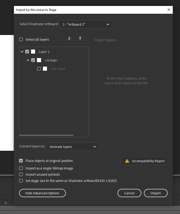 Hello, I'm not able to import Illustrator file in Animate they are just giving me a blank layer. can yu please help me.