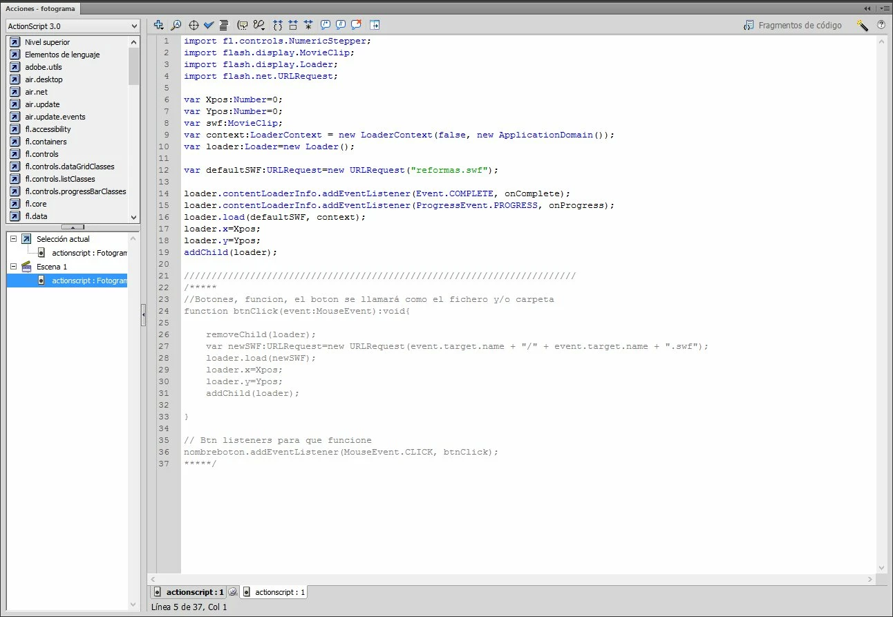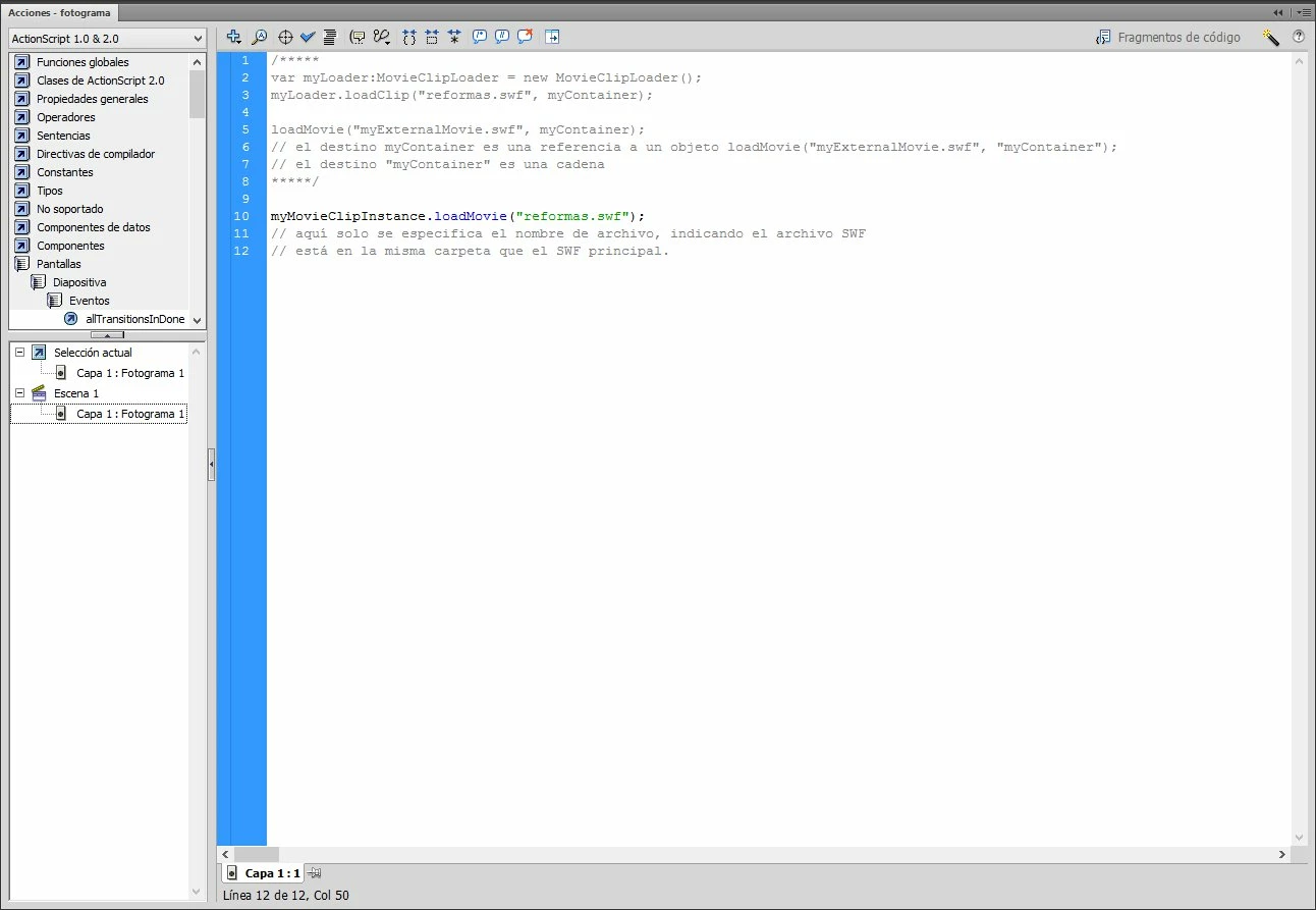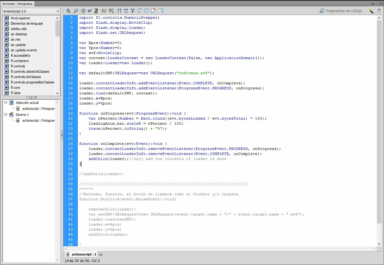 · var context:LoaderContext = new LoaderContext(false, new ApplicationDomain()); var loader:Loader=new Loader(); var defaultSWF:URLRequest=new URLRequest("reformas.swf"); loader.contentLoaderInfo.addEventListener(Event.COMPLETE, onComplete); loader.contentLoaderInfo.addEventListener(ProgressEvent.PROGRESS, onProgress); loader.load(defaultSWF, context); loader.x=Xpos; loader.y=Ypos; addChild(loader);