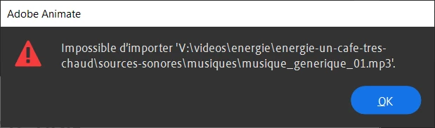 Et donc je travaille le son dans Premiere et ensuite je l'enregistre en MP3 mais quand je veux importer le fichier MP3 dans Animate j'ai un message d'erreur :