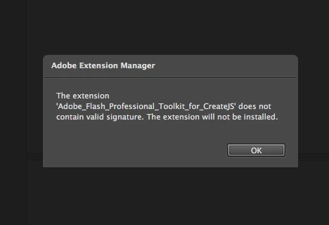 Can please some body help me while installing Toolkit_for_CreateJS on my Adobe Extension Manager CS6 .When I am trying to install the extension I am getting Invalid signature error.