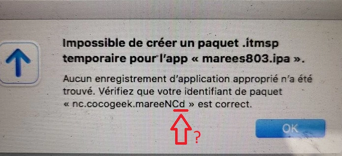 "no app found with this signature. Check if "nc.cocogeek.mareeNCd" is correct."