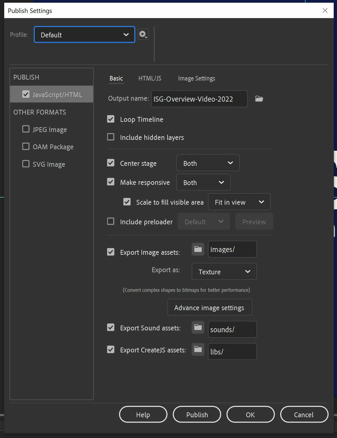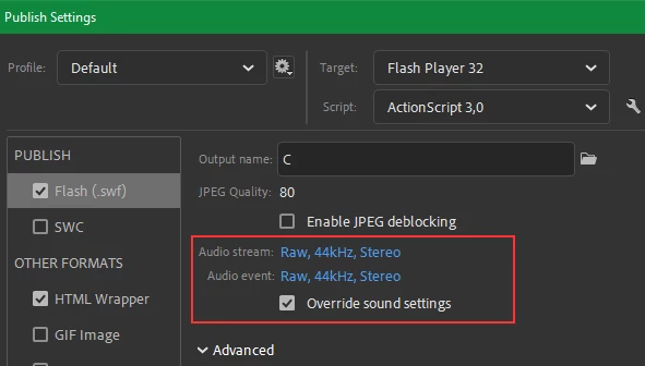 Second, no matter what video format I choose to export it, the audio comes out as crap. I captured and tweaked the audio in Adobe Audition, and it sounds nice and clean. When I export it in the video, it comes out with an echo, has a lot of static and sounds like I am speaking through a tube. I see no options at all in Animate for handling the audio. I do not understand how it corrupted audio that sounded fine in Animate when testing. Again, I see posts where people point to options to change sound or video quality under Publish Settings, but I see no such options on my screen. I am using the fully licensed Animate version 22.06 with the complete Adobe Creative Cloud subscription.