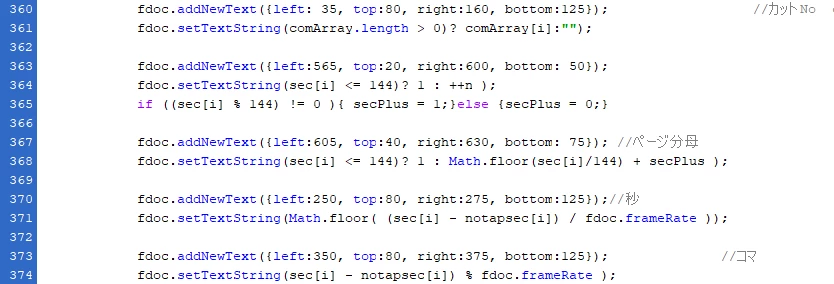 else if ( j >= splitCamera && j < cellLayerCount){addText( dxDouga,splitCamera,oxDouga );exTxtSet();continue;fl.trace("8 " + fltl.layers[cellLayerArray[j] + 1].name + "[" + dougaMatrix[i][cellLayerArray[j]] + "]");continue;} // 動画欄記入