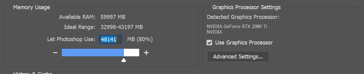 When I am making a BIG canvas project - I need more memory for 100s of complicated movieclips and tweens. I need to use my 2080Ti graphics card -- I can use them in Photoshop, as seen: