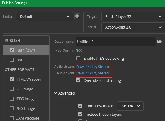 HI! I'm currently using the newest version of Animate on Windows 10, and I've been having issues importing a .wav file to animate with. I don't know if I'm putting it in the right place (I'm putting it on a layer and just making a ton of new frames), or if something is off. Whenever I try to listen to the audio, while animating or after exporting, it sounds bit-crushed and low-quality. When I just listen to the file itself, it sounds perfectly okay. I edited the audio in Premiere, and the output is 48,000 Hz, at 16 bit. I messed around with the properties in the file in the library in Animate, but no matter what I tried (speech, MP3, raw, etc), they all still didn't sound pure. I REALLY want to start making this cool video idea I have, but the crappy audio is holding me back. Any thoughts? (thank you so much!!)