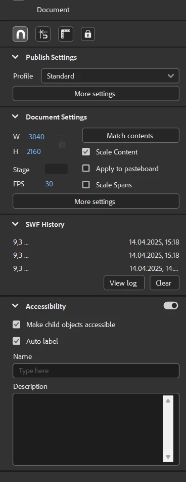 i am using the document settings as shown below, which I set to a resolution of a 4k-Display. When I publish the movie to an ".exe"-file, the resolution is very bad (not only the images but also lines, rectangles, ... .