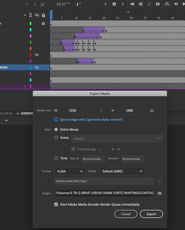 Media encoder not auto opening and converting when I export avide/media file from Animate