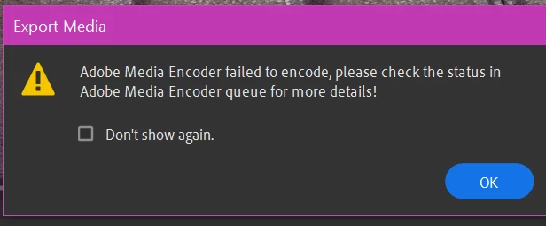 Hi ive been using adobe animate and media encoder for about a year now when all of a sudden I cant export any animation to media encoder. I've tried with 2 very different animations and both had the same error export as video/media the swf bar loads media encoder pops up then a error appear in adobe animate saying to check media encoder for details I will send both here. Please help me I desperately need to start some Christmas animations and I really need to export them. Thank you and let me know if you need more info.