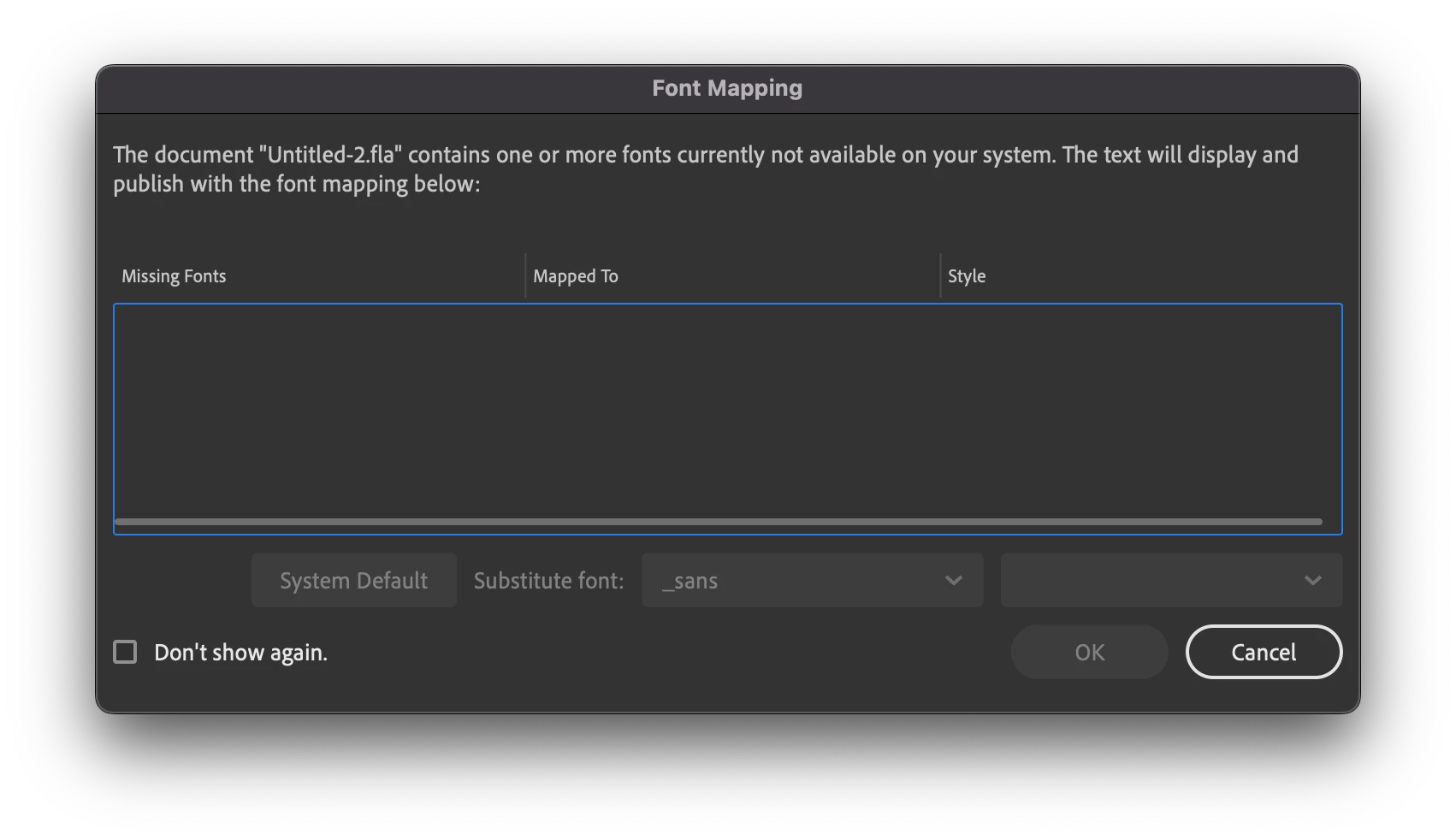Missing fonts aren't detected anymore? As an example I have created a document with a text line set to 'Open Sans'. When I deactivate Open Sans and open the FLA file it should say that this font is missing and offer me the choice to replace it. But instead it just opens the document and turns all texts for which the fonts are missing into Helvetica. When I go to Font Mapping I also see no mention about missing fonts. This is both on my Mac at home and at work. I'm using Animate 2023 (23.0). And since this update 'missing fonts' isn't working anymore. Probably Animate needs another update?
