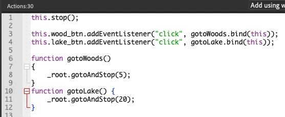 I set up a variable in Frame 1 of the main timeline _root = this to access the main timeline from within the movie clips. When I test the movie, I can navigate from the first movie clip to the second, but then I can't move from the second to the third. It also looks like the entire canvas is clickable after the first frame.
