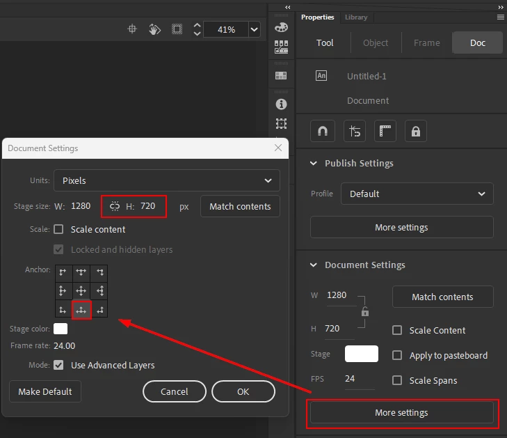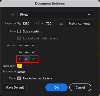 I'm finishing up an animation and I'm getting ready to export the file, but I realized last minute that the character's arms go past the stage canvas on top, meaning it won't export that part of the character animation. I tried adjusting the stage's size so it can fit, but when I make the stage taller in height, it only creates space downards when I want space to be created upwards. Is it possible to do the thing that Adobe Illustrator does and just adjust the canvas size by dragging the size manualley?